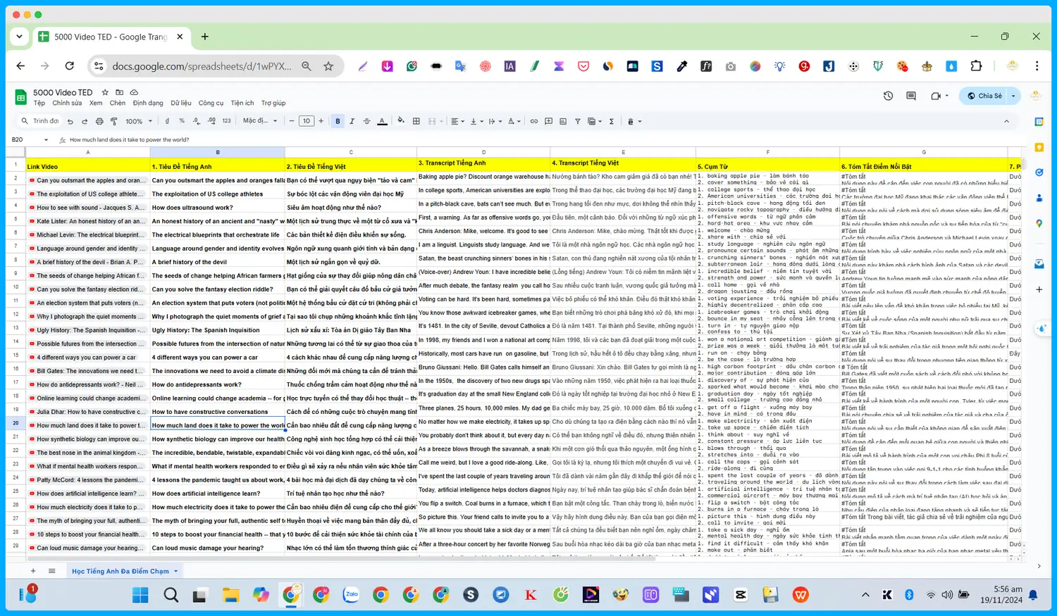 Mình đã tạo ra một file Google Sheet duy nhất chứa hơn 5000 video của các kênh youtube: TED, TED Ed, và TED Talks.